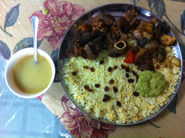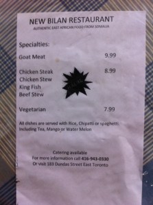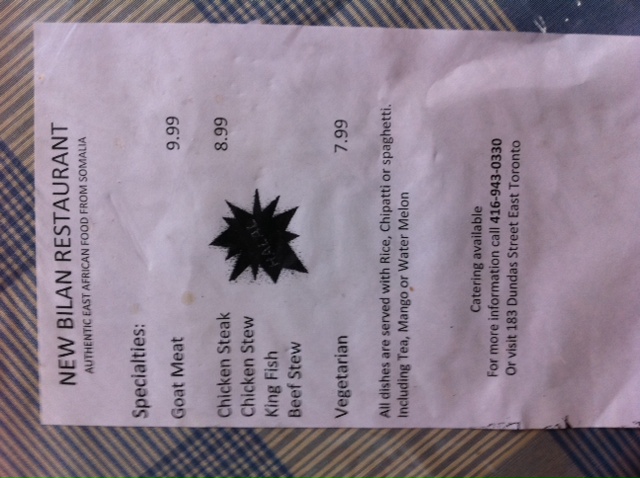 I write this blog entry as my wife and I pack-up and get ready to move. With pots, pans and utensils in boxes, only the best take-away will do tonight. I had eaten in the dining room at New Bilan once before, and although the food was fantastic, I couldn’t help but notice that ordering to-go was the far more popular option amongst patrons. I chalk this up to the less-than-savory atmosphere of the place. I just can’t stay away, though; the Somalian/Bangladeshi food is that good.