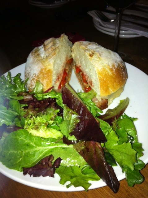 Tucked away in a commercial building on King St E (with a side entrance on Ontario St.), the place is packed on Wednesday at lunch. We’re lucky to get a seat for four, sharing half of a rustic dining table with other patrons (who we ended up knowing). I’m quickly surprised at how economically priced the Sandwiches are… about half-a-dozen that are $10 or under with a Side Salad of Mixed Greens. The Beccato (pictured above) is stuffed full of Grilled Sausage, Roasted Red Peppers, Tomato Sauce and Provolone Cheese… and like all the Sandwiches on the menu, is available at lunch only (from Noon until 4pm).
