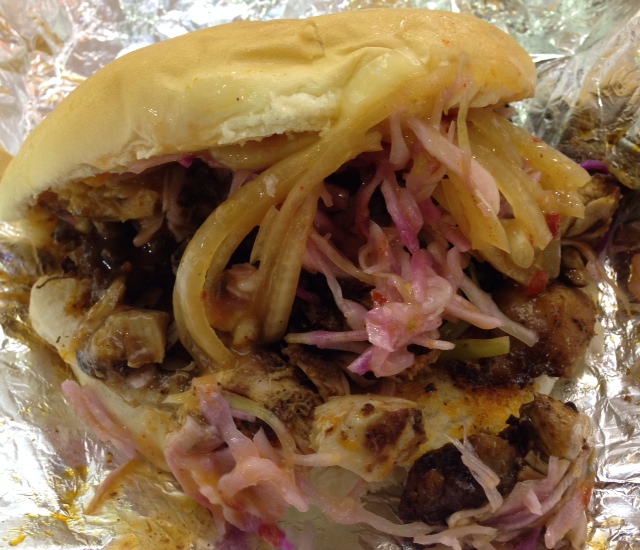 truly the best jerk chicken sandwich ever comes in the patty with Coco bread slathered in oxtail gravy and coleslaw oh my God! for under six dollars you’ll be so full and feel so good keep on coming back for more and more I have all my coworkers hooked on it