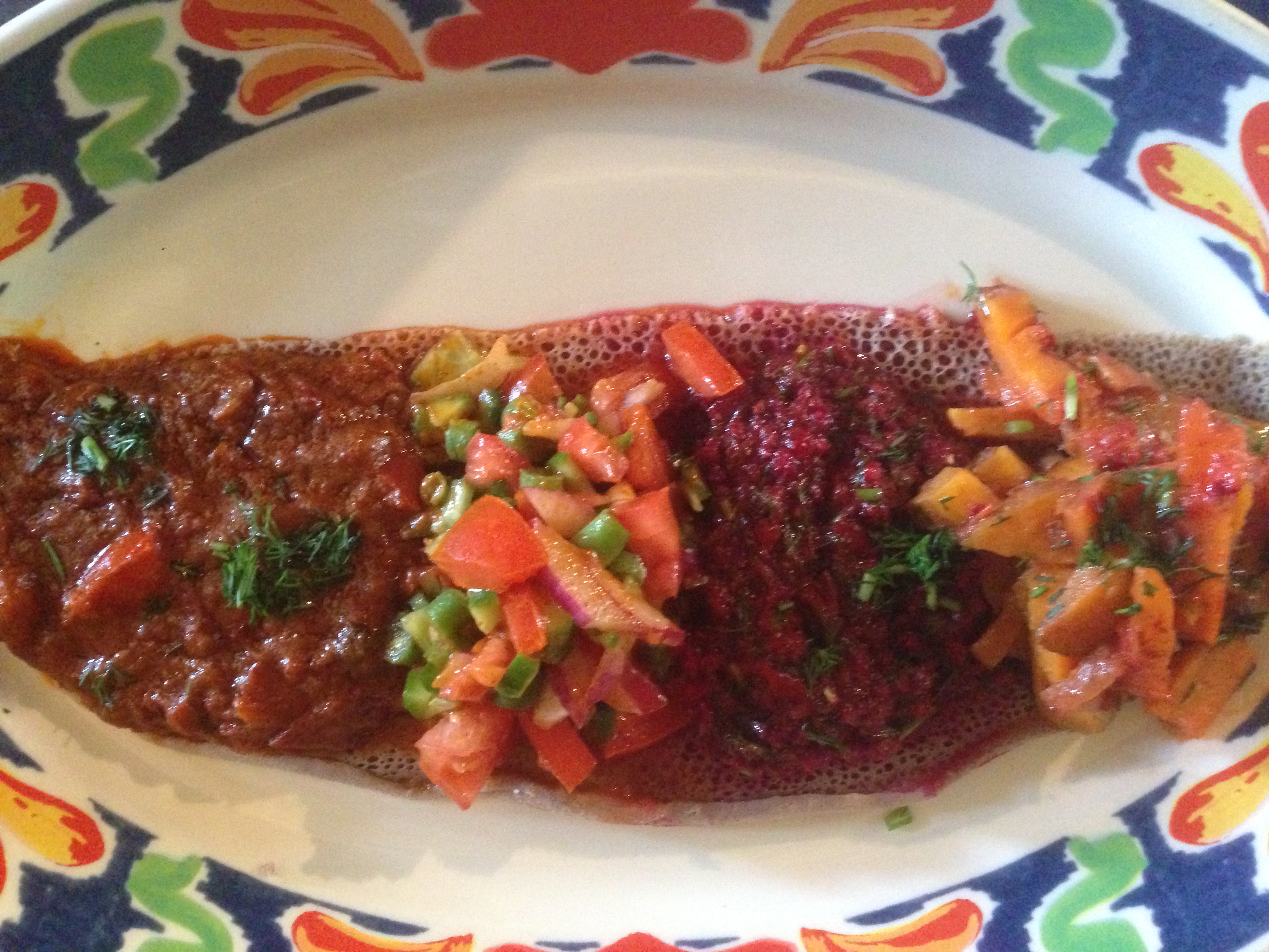 I opt for the Keeffaa Platter ($15), composed of grilled Lamb Tibs, a Yam/Yellow Pepper/Coconut Milk Mash and a made-to-order Tomato, Onion and Chili Salad. My gluten-free Injera is toasted, offering a nice contrast that softens as it soaks everything up on the plate. I finish quickly despite the large portion size.