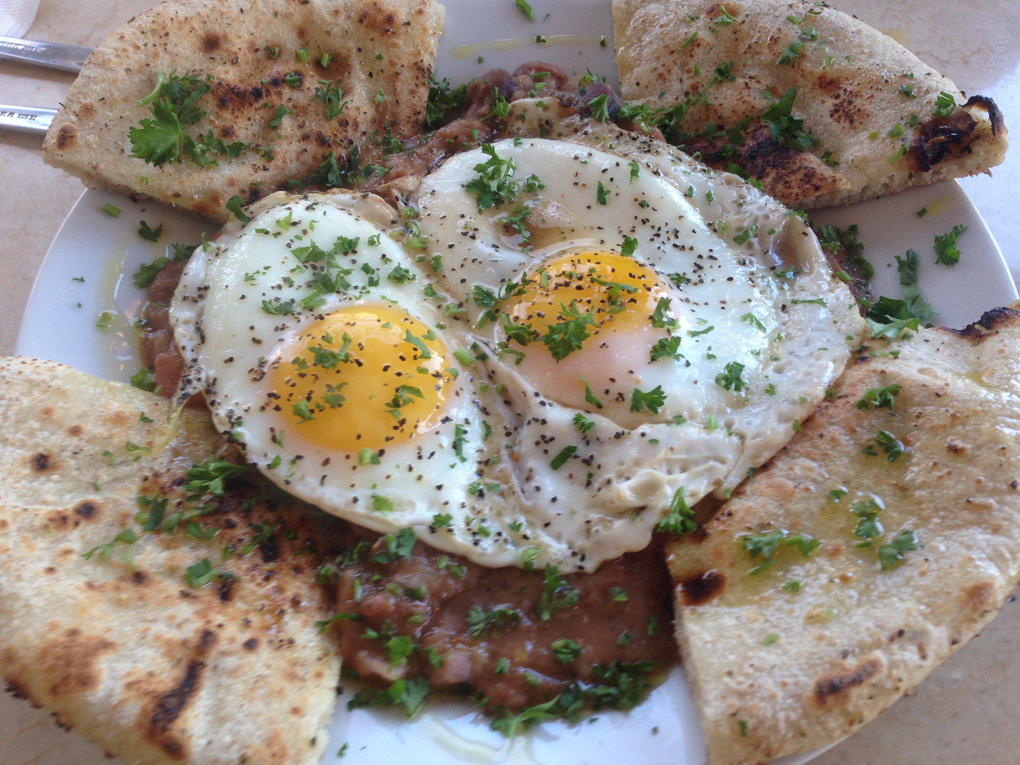 Eggs on foole ($11) is a most traditional Egyptian breakfast dish. At Maha’s the eggs are made to order, served atop a mélange of mashed fava beans, diced tomatoes and onion. I tend to order my eggs sunny-side-up so the yolks run into the foole. By looking at the tables around us, hard-boiled eggs seem to be another popular rendition. Just ask for the Cairo Classic. The dish is completed with pieces of toasted balady bread, and I can’t help use the crispy flatbread as more of utensil.