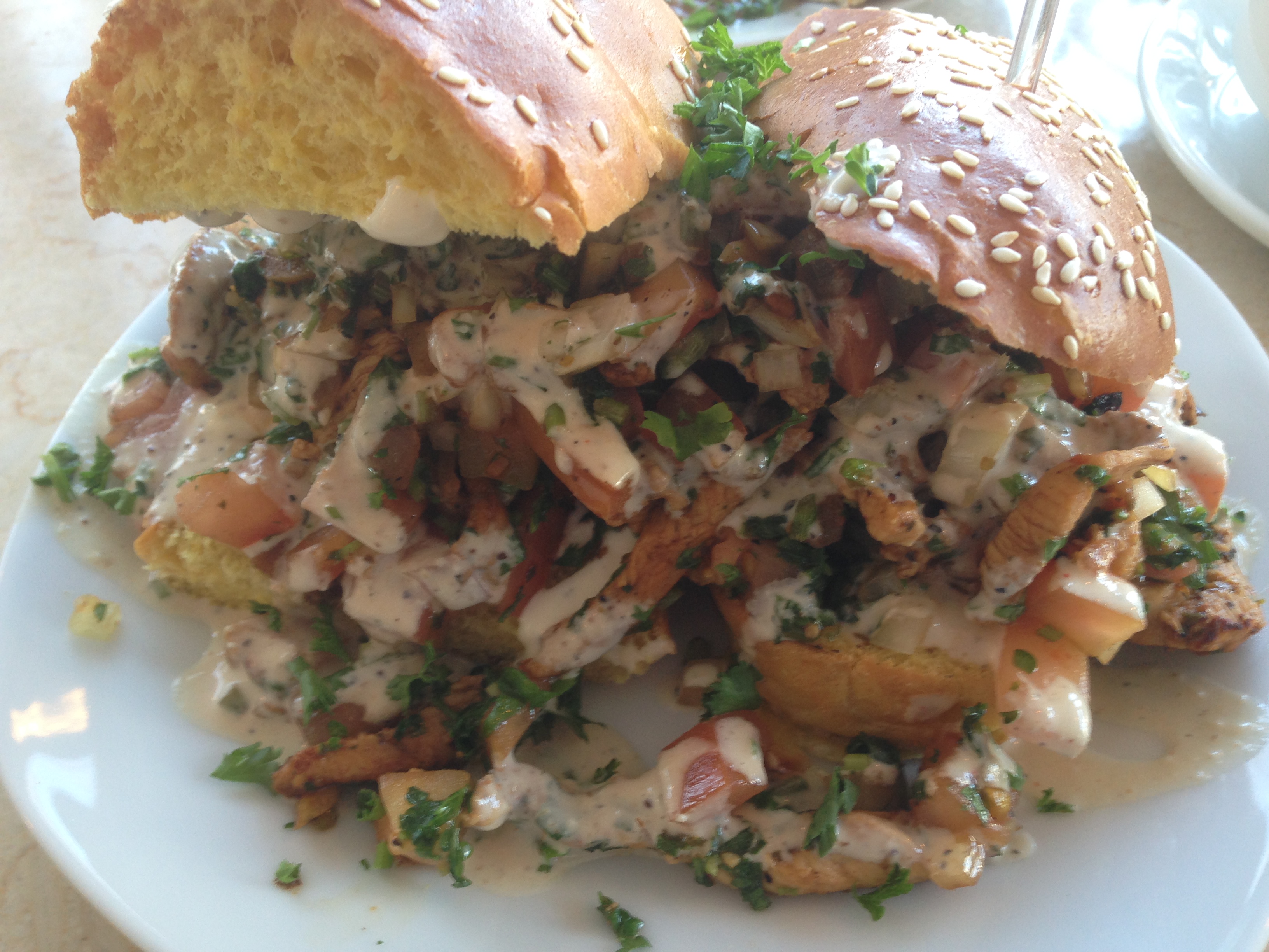 Maha’s Mind Blowing Chicken ($8) is quite possibly one of the best Shawarma sandwiches I have ever eaten. Grilled chicken is tossed with parsley, onions and tomatoes. The mixture gets liberally applied to a toasted egg bun and then doused with tahini, tomeya (garlic sauce) and optional hot sauce. This sandwich is so big that a knife and fork are absolutely necessary.