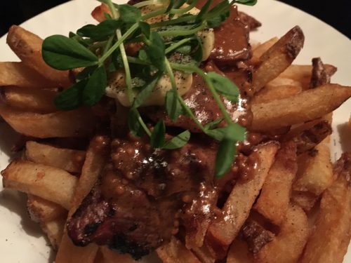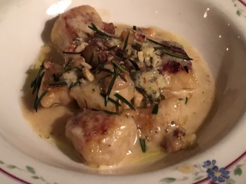 Vegetarians’ interest may be piqued by the Acorn Squash Dumplings (topped with Walnuts and a Stilton-Rosemary Cream).