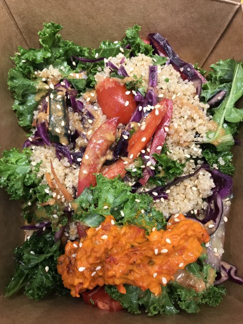 Quinoa Salad ($10) is loaded with kale & julienned veggies and tossed in a lime/peanut dressing. The show-stopper is the dollop of ajvar, which I now liberally apply to just about anything. This salad box has quickly become a once-a-week go-to for me. Best lunch on the block (imo).