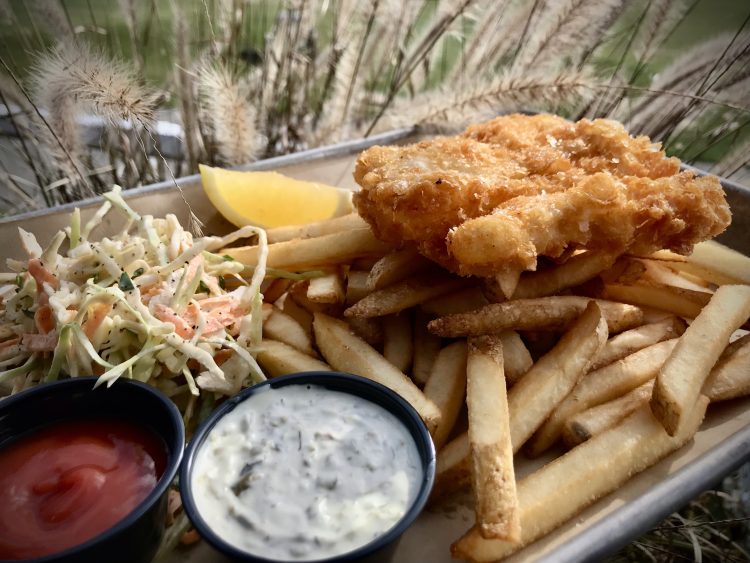 If you’re more inclined to sit on the patio and relax after walking 7000 yards, we recommend the Fish & Chips. Potato flake-crusted cod served with creamy slaw, fries and tartar for dipping. Get in our belly!