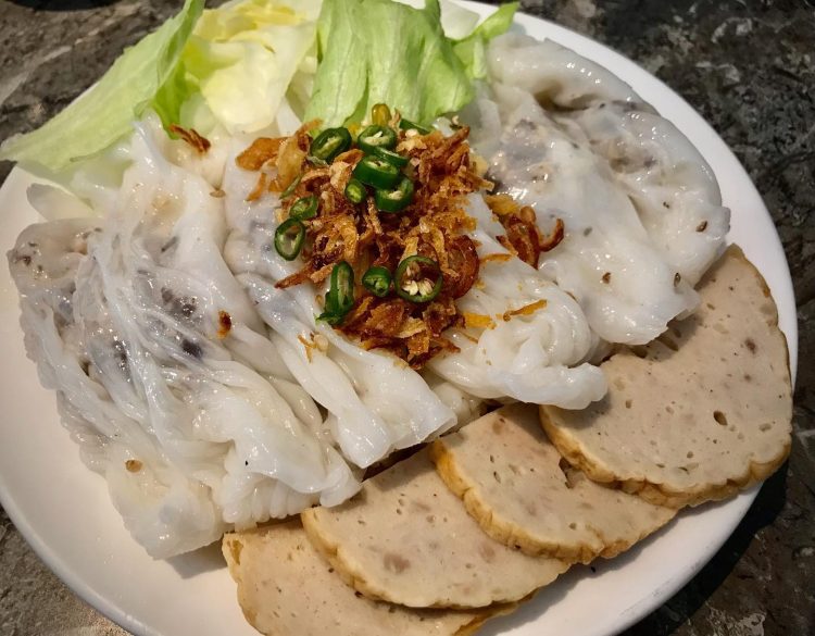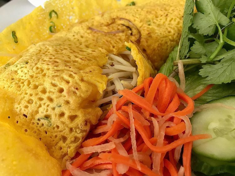This savoury crepe is made with rice flour, coconut milk and turmeric.  Paper thin and delicately crunchy, it comes filled with shrimp, pork belly, bean sprouts and jicama.  Served with lettuce cups and quick-pickle salad for wrapping & dipping… this is one of the best things we’ve eaten this year!