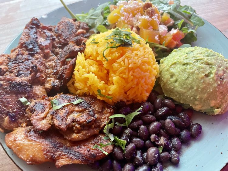 Then pick any three sides: guacamole, plantain, black beans, yuca fries, beet salad. Rice is included.