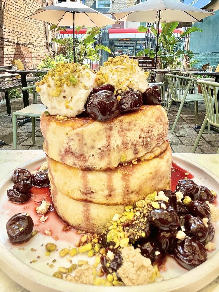 We start with the Pasaj Pancakes. These bad-boys are light, cloud-like stacks that manage to be both delicate and decadent. They’re topped with tart sour cherry jam, creamy labne, sweet tahini helva, and a generous dusting of crushed pistachios. It’s not just breakfast; it’s a masterclass in balance and texture. The sweet and tangy layers hit every note without ever becoming overwhelming. If you’re the kind of person who usually “doesn’t do pancakes,” these’ll change your mind. Facts!
