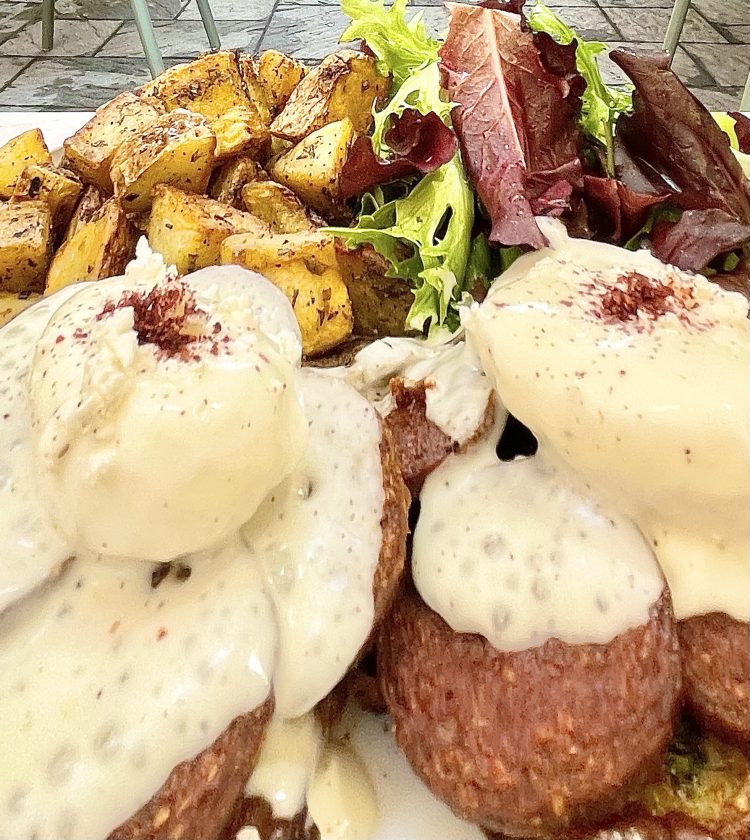 Then come the Sucuk Bennies, served atop crispy zucchini fritters in place of the usual English muffin. It’s a thoughtful swap. The fritters are light yet satisfying, with enough crunch to stand up to the velvety poached eggs. The sucuk sausage adds a warming spice, and the house potatoes seal the deal. It’s bold; it’s balanced; and it’s better than any brunch standard we’ve come to expect.