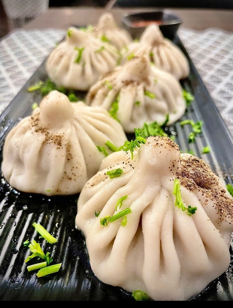 Khinkali are big, steamed parcels filled with heavily-seasoned lamb and finished with extra pepper. The dough is soft but purposeful, built to hold in the juices. There’s broth inside, which means there’s a right way to eat them… and a wrong way you usually only try once.