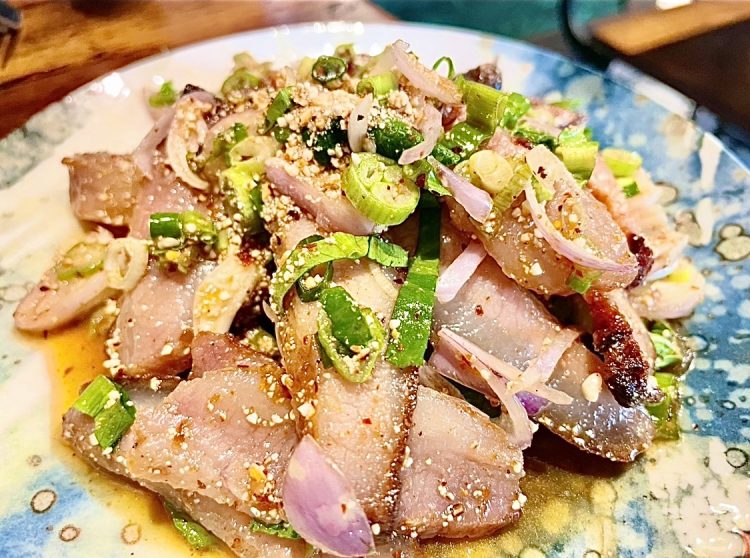 Nam Tok Kor Moo at Somtum Jinda (76 Gerrard St E) is straight-up Isan cooking… bold, herbal, sharp, and built around contrast. This is food rooted in a family tradition from Ubon Ratchathani, brought to Toronto without sanding off the edges.