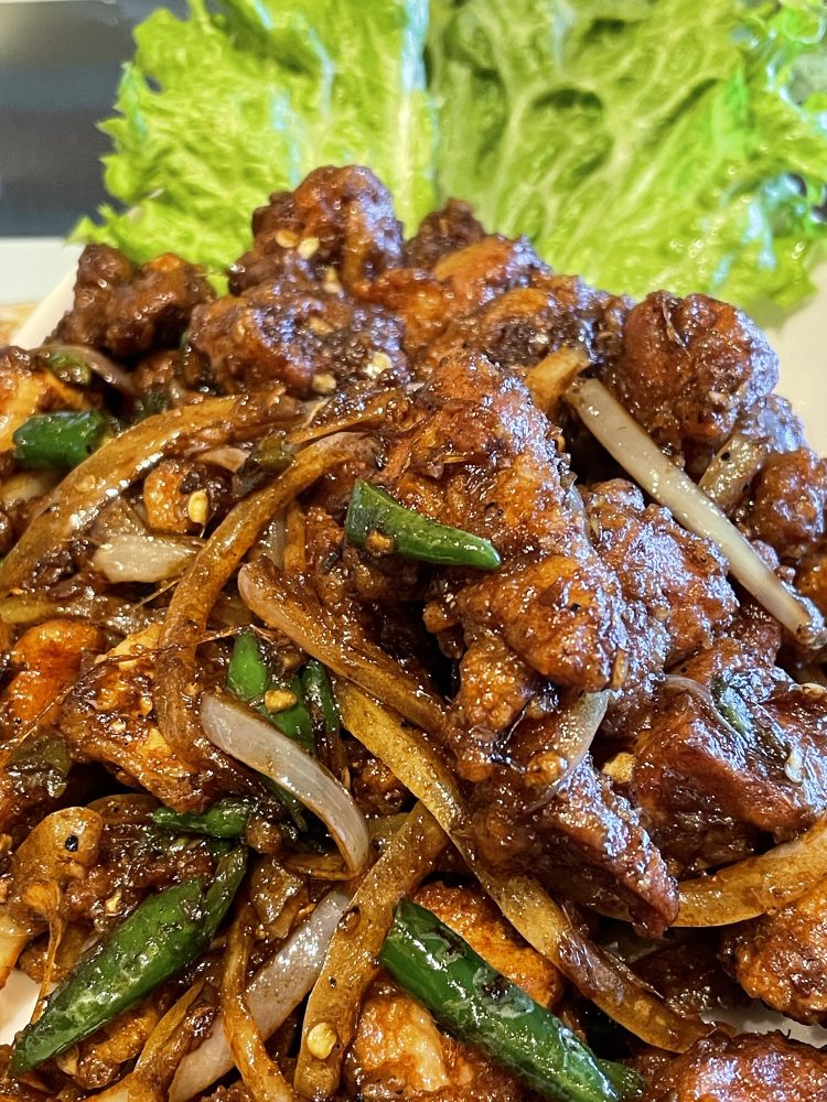 Our go-to is the dry version, which means nothing’s softened by sauce. Chicken fried hard, edges crisp, tossed with chilli, onion, and pepper that refuses to fade into the background. Savory, spicy, Halal, a little unruly, and impossible to stop picking at.