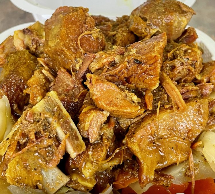 Curry goat… slow, rich, fall-off-the-bone. We love it with their steamed veggies to let the juices flow.
